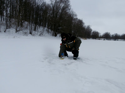 К 12-00 я был уже на месте и первым делом занялся сверлением лунок. Лед на водоеме был не менее 30 см, поэтому не смотря на оттепель, стоять ему еще недели три, а то и месяц...