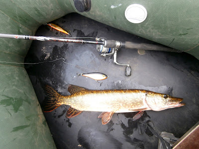 Минут через 10-15 произошла следующая поклевка на твич той же приманки. На этот раз щучка была поменьше, грамм на 600, но тройники ее засекли более надежно.